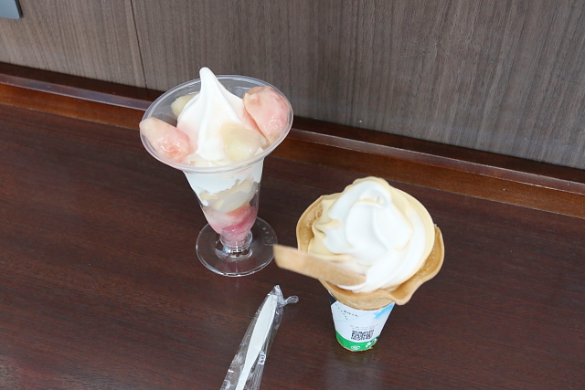 40.ミニ・ストップで、白桃パフェと、ソフト・クリーム購入。アプリ割引券利用 |